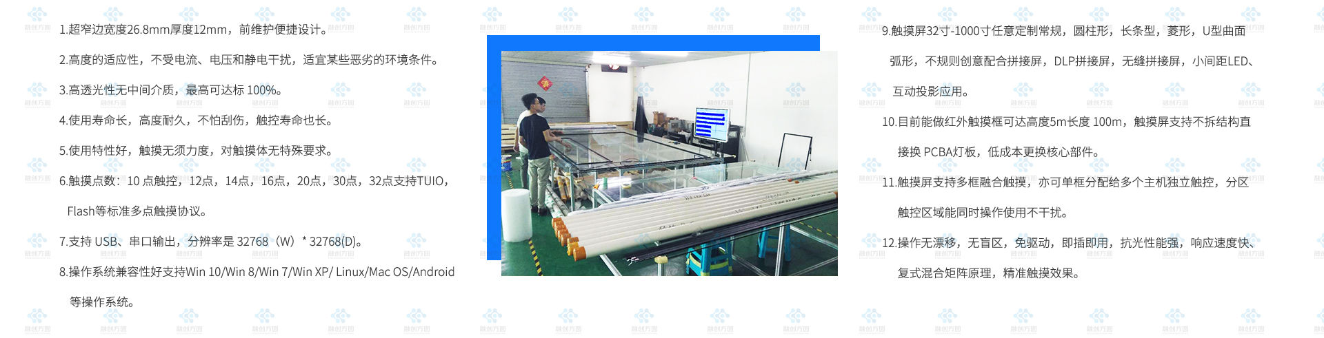融創(chuàng)方圓55寸2×2拼接觸摸屏入駐深圳某產業園大廳主要用來可視化數據集中顯示互動觸摸屏需求。 55寸2×2拼接觸摸屏對角線為110寸拼接大顯示觸摸屏,...